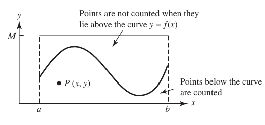 In the graph, , where and . Now we select a random point in the rectangle. Create two counters, one to count the total points and the other to count the points in the region below the curve.